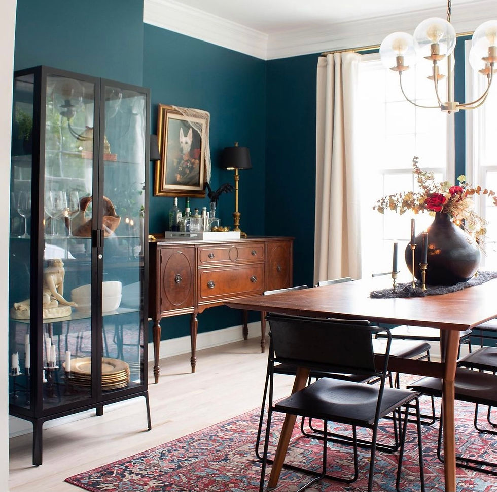 I have always been drawn to jewel tones, but I am always cautious to add too much color to our walls (team white walls for life!), but I figured a small space like this could handle a fun, bold color. I was inspired by the color of Cass Makes Home dining room and these photos from Pinterest.